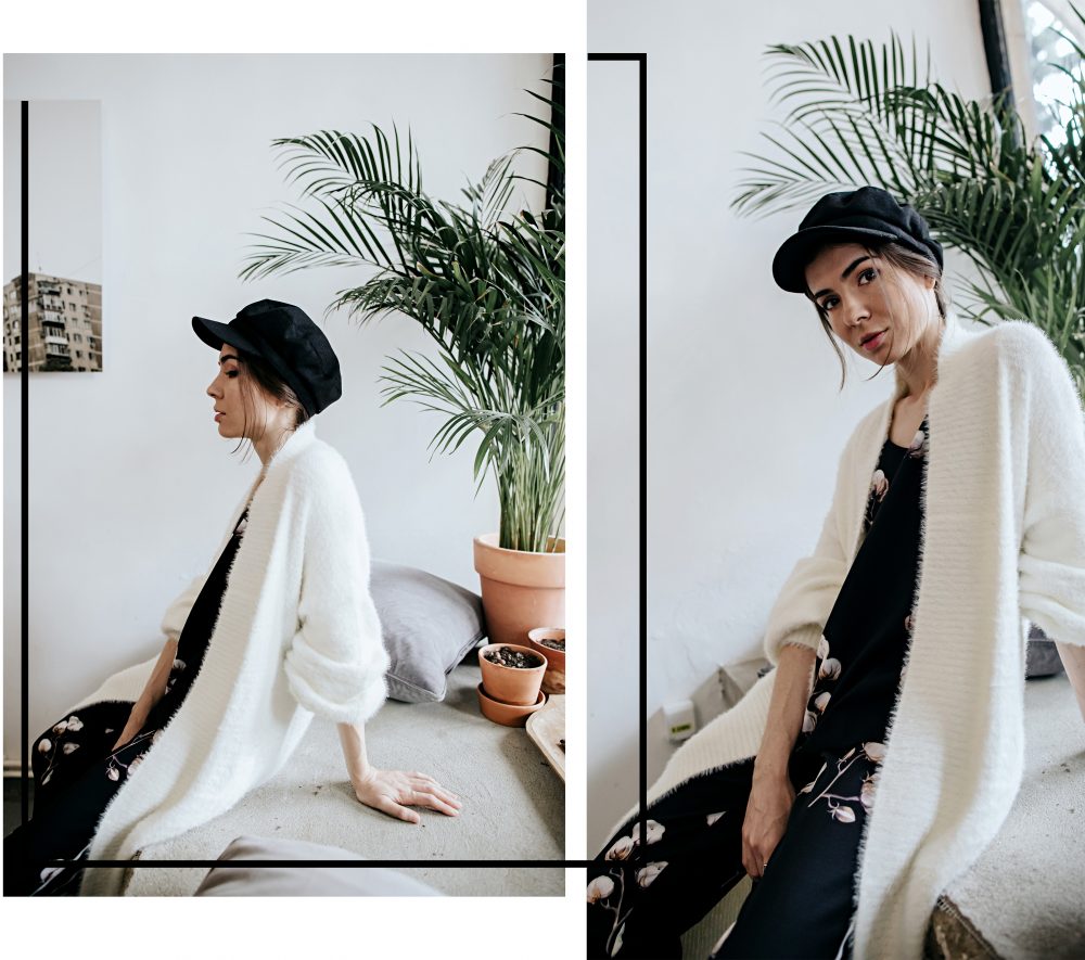 Cardigan moale | Top cu imprimeu floral | Pantaloni cu imprimeu floral | Ghete sport | Geanta rotunda |